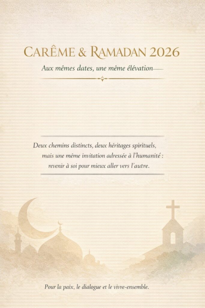 Le calendrier de l’année 2026 offre une rencontre rare et hautement symbolique entre deux grandes traditions spirituelles. Le Carême, temps de préparation intérieure à la lumière de Pâques dans le monde chrétien, et le mois de Ramadan, période sacrée pour les musulmans marquée par le commencement de la Révélation coranique, se déroulent cette année aux mêmes dates. Deux chemins distincts, deux héritages spirituels, mais une même invitation adressée à l’humanité : revenir à soi pour mieux aller vers l’autre, et œuvrer ensemble à rendre le monde plus habitable.